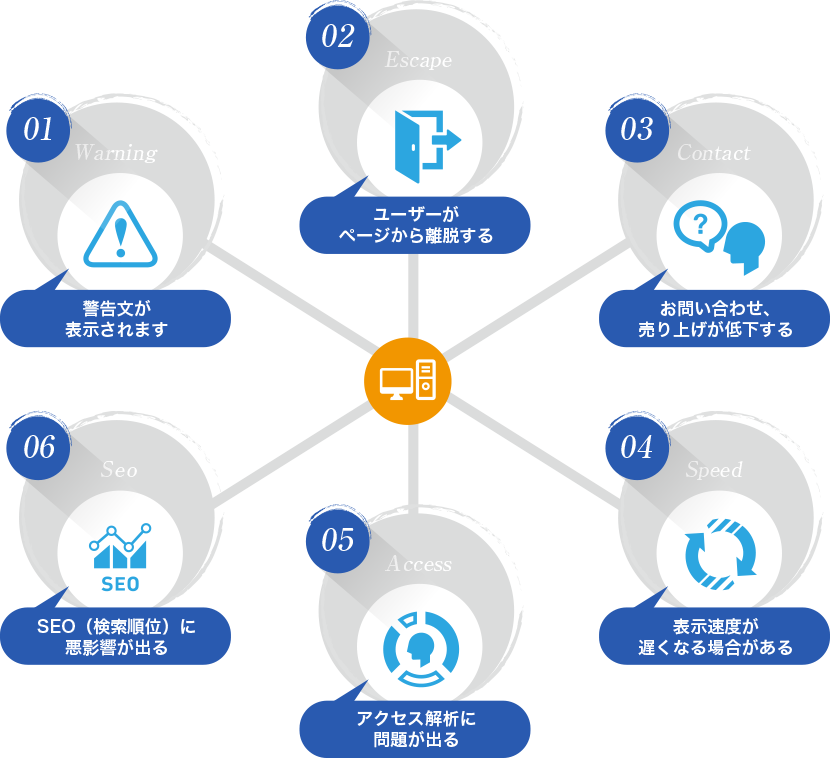 SSLに対応していない外部スクリプトやアフィリエイト広告などの有無をチェックし、それらを含むページをどのようにするのかを相談・決定したします。